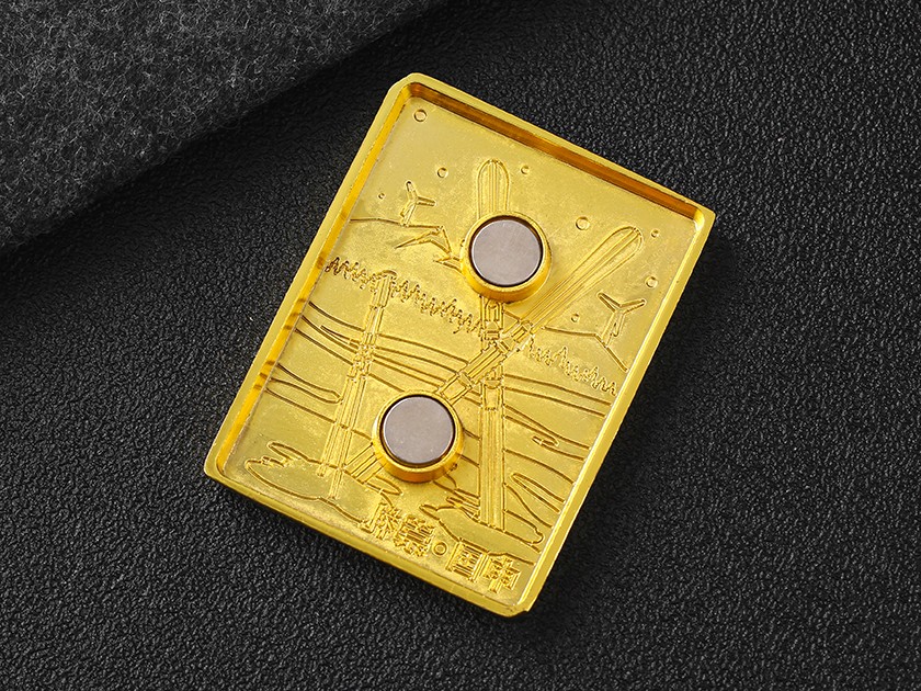 【制作工藝】:沖壓 【上色工藝】:烤漆 【電鍍顏色】:金色 【背面工藝】:金屬凹凸 【產品配件】:磁鐵扣